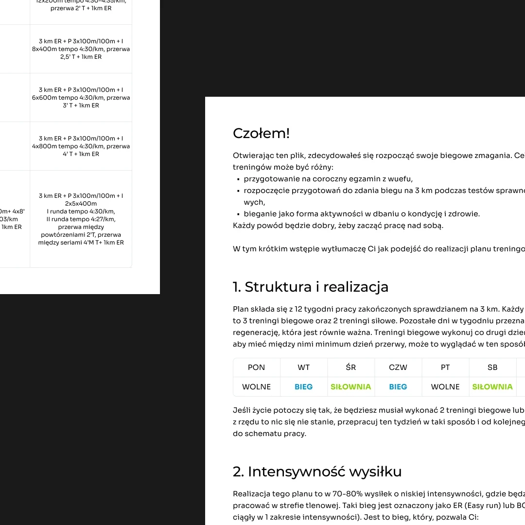 Plan jest dla Ciebie, jeśli możesz już przebiec 3 km w ciągłym biegu i chcesz atakować wynik. Jeśli dopiero zaczynasz – wróć do REKRUTA, zbuduj bazę i wróć tu po swoje.